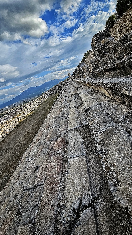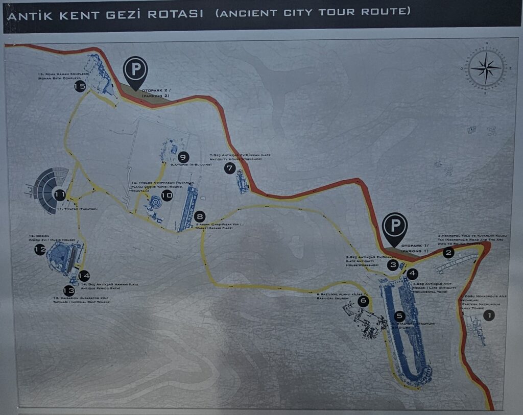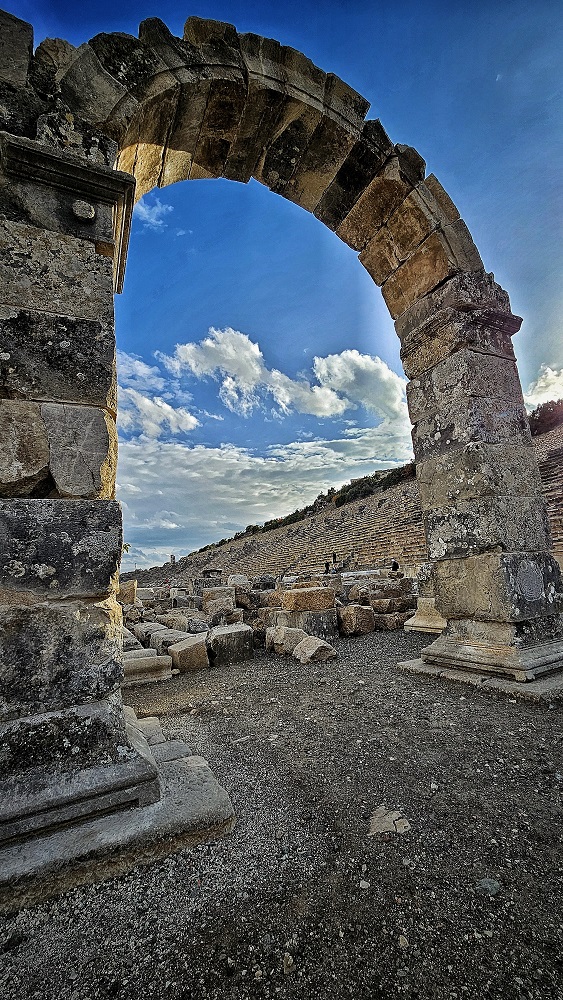 The city’s settlement area is quite extensive. The buildings are arranged symmetrically, with hilly terraces dominating the lake and plain views, ensuring that no structure obstructs the view of another. As you enter the city, on the left is a magnificent monumental gate and the most magnificent stadium in ancient Anatolia, with a capacity of 12,000-13,000 people.