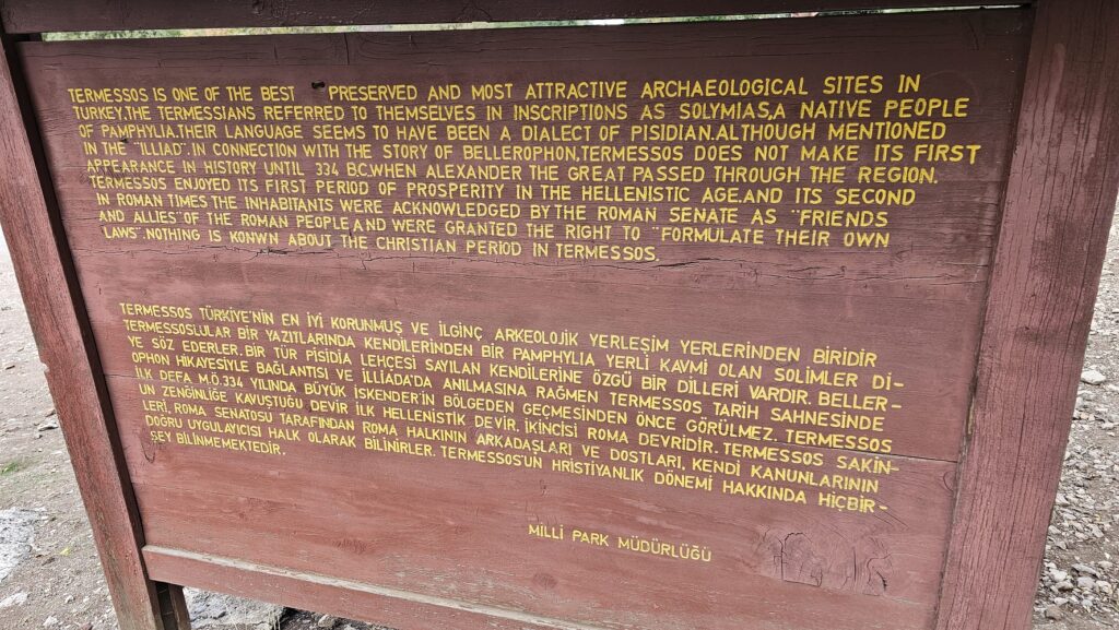 To reach Termessos, which is about an hour from Antalya city center, you travel northwest. Since my next destination was the ancient city of Kibyra, I left early in the morning and spent half a day there. I entered the national park by car, followed the winding road up, enjoying the stunning views, and parked at the parking lot where the official site begins. There are some ruins here, but to explore the main city, you’ll need to climb a path. I advise you to be physically prepared for some hiking (like shoes) and to be mentally prepared for the slopes. I did the entire route; at the end, I’d have walked approximately 8-10 km. Shorter routes are possible, but it’s worth the effort!